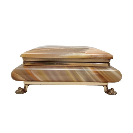 Ce coffret à bijoux vintage italien en onyx, datant des années 1960/70, est une pièce élégante et décorative, réalisée en marbre onyx. Le coffret présente un magnifique motif de pierre naturelle et repose sur de petits pieds en laiton. En excellent état.