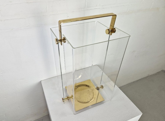 Rare porte-parapluies David Lange, années 1970. Les détails en laiton et le Lucite/Perspex transparent lui confèrent une allure aérienne et d'une élégance discrète. En bon état vintage, avec une légère usure des supports de parapluie situés sous le porte-parapluies.
