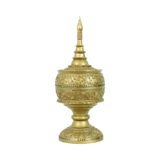 Magnifique grand bol à offrandes vintage en bois, doré à la feuille d'or, Birmanie, vers le milieu du 20e siècle. Il a été recouvert de peinture, à certains endroits la peinture s'est estompée et la feuille d'or est encore visible, décoré de manière élaborée avec des volutes, des motifs et des morceaux de verre de différentes couleurs, l'intérieur du bol à offrandes est laqué en rouge, le dessus est encore entièrement intact et peut être enlevé, objet impressionnant de grande taille, pièce de collection ! En bon état vintage, quelques morceaux de verre manquent, quelques signes d'âge et d'utilisation, où le bois sous-jacent est visible, voir les photos pour plus de détails ! Dimensions : 49cm de haut, 20cm de diamètre. Poids : 1,838 kg.