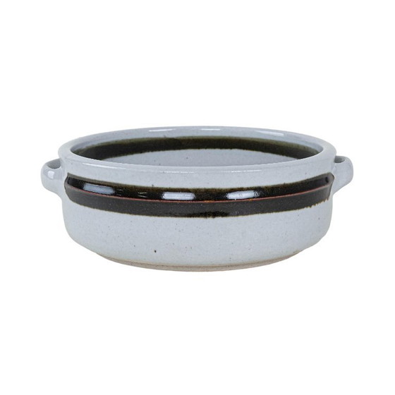 Céramique d'atelier scandinave signée Hanne Stentøj, ornée d'un motif peint à la main dans des tons bruns et noirs sur fond clair. Sa forme épurée et distinctive, agrémentée de délicates anses latérales, est typique du design danois des années 1960 et 1970. Idéal comme coupe à fruits, élément décoratif dans un intérieur vintage ou pièce de collection.