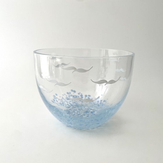 Bol en verre bleu Lindshammar peint à la main d'oiseaux