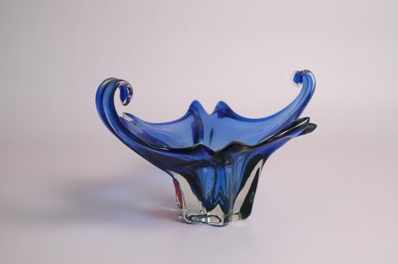 Ce bol de Murano soufflé à la main, de 19 x 42 cm, est un magnifique exemple de savoir-faire. Exécuté dans un bleu cobalt profond avec des accents de couleur subtils, ce bol attire tous les regards. Son design unique et ses lignes fluides en font une pièce décorative parfaite pour tout intérieur. Il est idéal pour présenter des fruits, des fleurs ou comme œuvre d'art à part entière.
