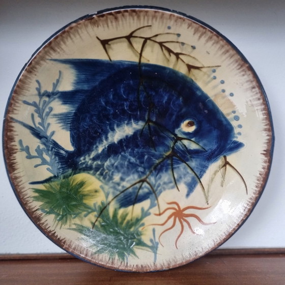 Magnifique bol/assiette murale Puigdemont, Espagne. Décorée d'un poisson bleu parmi des plantes aquatiques.