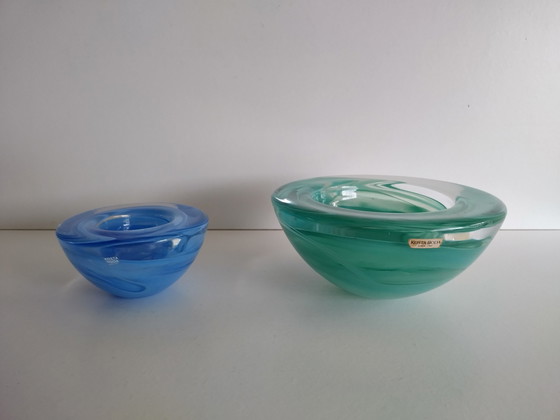 Ensemble de deux bols Atoll de Kosta Boda . Dessiné par Anna Ehrner en 1997. Pays de fabrication : Suède. Le bol vert a une hauteur de 8,5 cm et un diamètre de 17,5 cm. Le bol bleu mesure 6,5 cm de haut et 11,5 cm de diamètre. Les deux bols sont marqués et en très bon état. Les bols sont emballés et expédiés avec soin.