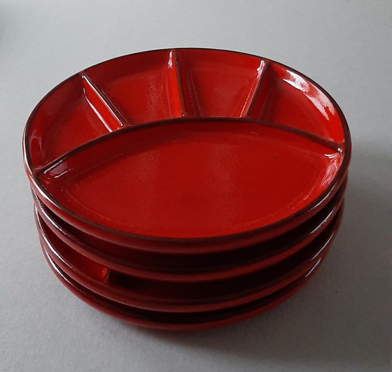 Ontdek de tijdloze elegantie van deze prachtige keramische borden van Jasba, vervaardigd in Duitsland in de jaren '60. Deze borden stralen een levendige rode kleur uit die elke tafelsetting direct opfleurt en een vleugje retro charme toevoegt aan uw interieur.