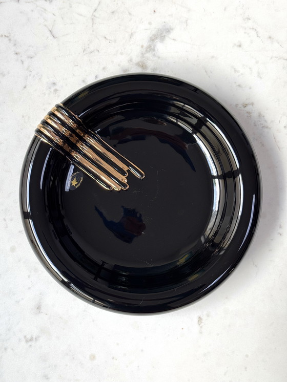 Cette pièce exquise en céramique incarne l'élégance contemporaine et l'artisanat raffiné. Doté d'une finition noire brillante et élégante, le plat présente une forme organique et fluide, avec des courbes douces qui créent une impression de mouvement. Les stries dorées qui s'étendent subtilement sur un côté constituent un élément de design frappant, ajoutant un contraste luxueux à la glaçure noire profonde.