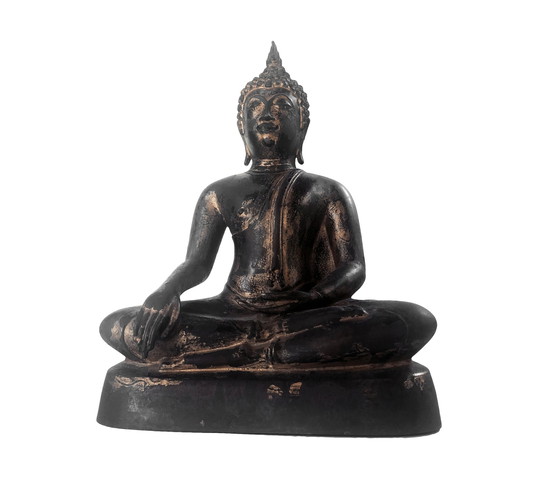 Bouddha Shakyamuni, Ayutthaya - Bronze avec des traces de dorures - Thaïlande - XVIIe siècle - H 34 cm - L 25 cm - P 15 cm - Très bon état, superbe patine - Bouddha Shakyamuni en position de prise de la terre à témoin. Assis en Virasana, placé sur un trône, la main droite en Bhumisparshamudra, la gauche posée sur un genou, vêtu d'un Sanghati, le visage à l’expression sereine, les yeux mi-clos, les lèvres souriantes, l’expression méditative, la coiffure bouclée et l’unisha surmontés de la flamme symbolisant son haut niveau de développement spirituel. Les lobes sont étirés, signe d’une jeunesse passée à porter de lourdes boucles d’oreille en or.