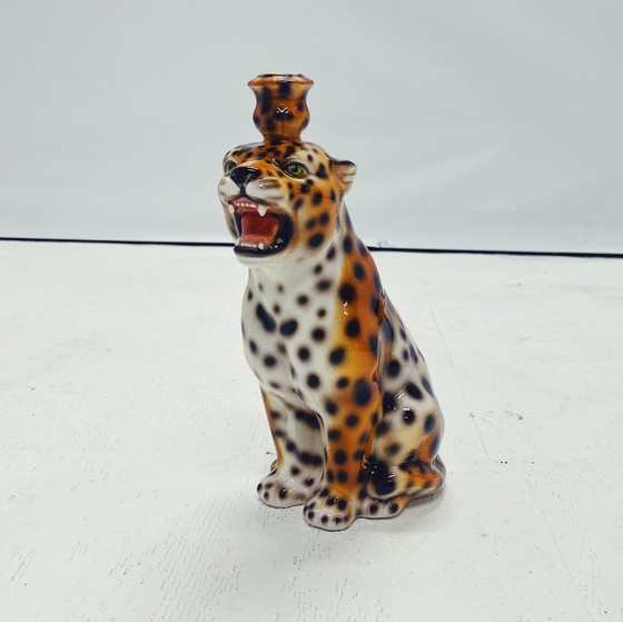 Bougeoir unique, fait main, en forme de léopard. Cette statue de style Hollywood Regency, réalisée en céramique peinte à la main et fabriquée en Italie, apportera une touche d'élégance et d'audace à votre intérieur !