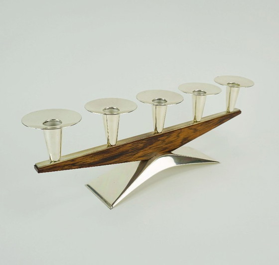 Bougeoir moderne du milieu du siècle, en métal argenté et bois, années 1950-1960