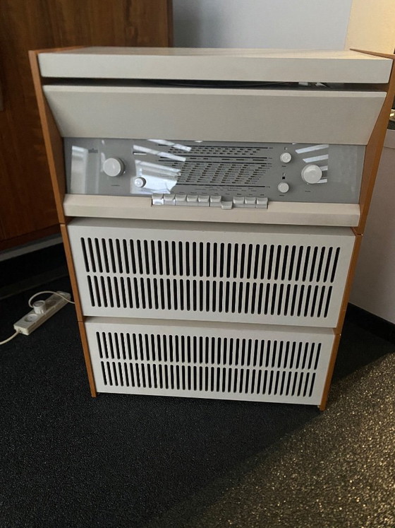 À vendre : un ensemble radio/platine vinyle Braun Atelier 2 vintage, un modèle allemand emblématique, accompagné d'une paire d'enceintes L1 de Dieter Rams. La radio a été entièrement nettoyée et révisée. Toutes les pièces électroniques nécessaires ont été vérifiées et réparées, ou remplacées si besoin par des pièces d'époque.