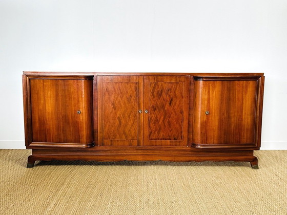 Les deux portes extérieures offrent un design courbés avec un léger débordement et les portes centrales sont travaillées en marqueterie de diamants.