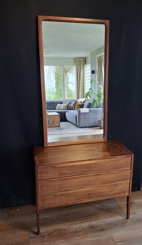 Composé d'une commode (modèle 34) et d'un grand miroir (modèle 166). Tous deux sont en palissandre et ont été conçus par Kai Kristiansen pour Aksel Kjersgaard.