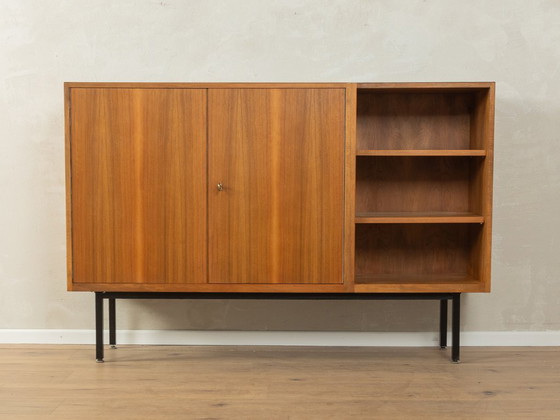 Magnifique buffet des années 1950. Corps en placage de noyer avec deux portes, quatre étagères et de nouveaux pieds carrés en acier noir. Le dessus est recouvert de Formica noir. Très bon travail, matériaux de haute qualité, fabriqué en Allemagne.