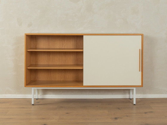 Buffet classique des années 1960. Corpus en placage de chêne avec une porte coulissante, quatre étagères et de nouveaux pieds carrés en acier blanc. La porte coulissante est revêtue de Formica blanc cassé. Fabriqué en Allemagne, fabricant : WK Möbel.