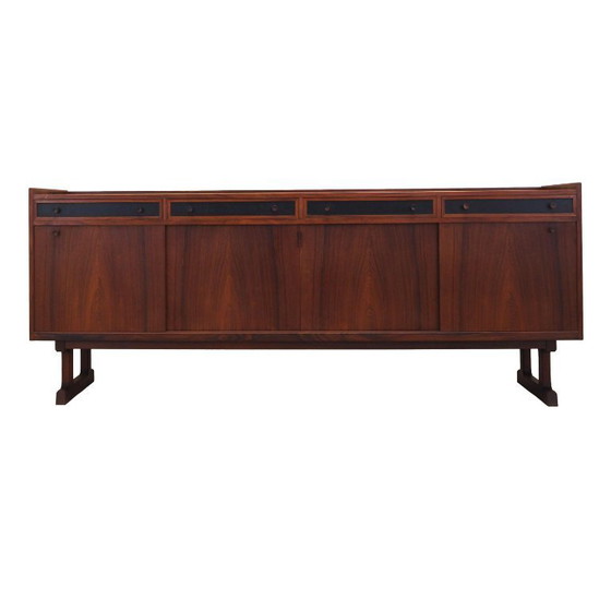 La structure est recouverte de placage de bois de rose. Les pieds sont en bois massif. La surface a été rafraîchie. À l'intérieur, l'espace est occupé par deux étagères pratiques réglables en hauteur et sept tiroirs spacieux. Le buffet est doté d'une solution pratique de portes coulissantes, qui réduit la nécessité de laisser un grand espace libre devant le meuble sans restreindre l'accès à l'intérieur. En outre, les portes coulissantes sont la solution idéale pour utiliser le meuble pour l'équipement audio.