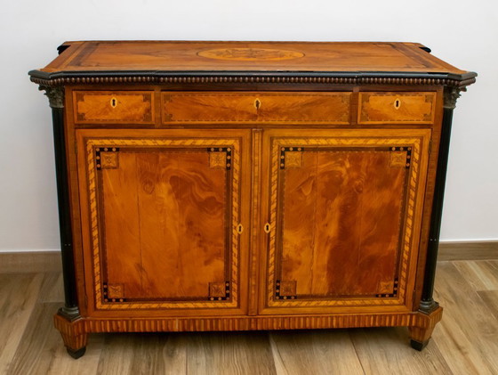 Élégant buffet finement incrusté de motifs floraux et géométriques. Il comporte trois tiroirs et deux portes avec des panneaux marquetés dans différentes essences avec des motifs géométriques. Enrichi de chapiteaux et de bases de colonnes en bronze doré. Le plateau ouvrant est incrusté de motifs géométriques et floraux, à l'intérieur duquel se trouve un récipient en métal argenté, utilisé comme bénitier.