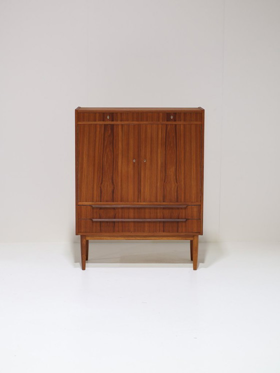 Magnifique armoire haute fabriquée par Andreas Pedersen Møbelfabrik à Svenstrup, au Danemark, dans les années 1960. Cette armoire est en teck, un bois au veinage exceptionnel. Elle possède deux portes, deux petits tiroirs et deux grands tiroirs munis de longues poignées élégantes. Les chants sont finement finis. Un design minimaliste et intemporel, dans un format rare !
