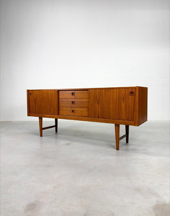 Le designer semble s'être clairement inspiré de l'esthétique danoise, mais les formes carrées et angulaires révèlent une interprétation néerlandaise de ce style. Ses pieds hauts et élancés, ses poignées carrées incrustées et ses bords subtilement biseautés en font un véritable plaisir pour les yeux. Ce buffet respire l'élégance et le raffinement et s'intègre harmonieusement dans presque tous les intérieurs.