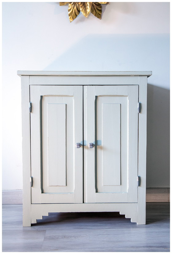 Adorable buffet parisien en bois massif recouvert d’une jolie peinture mat patinée, un joli gris avec une pointe verte, argile, minéral.