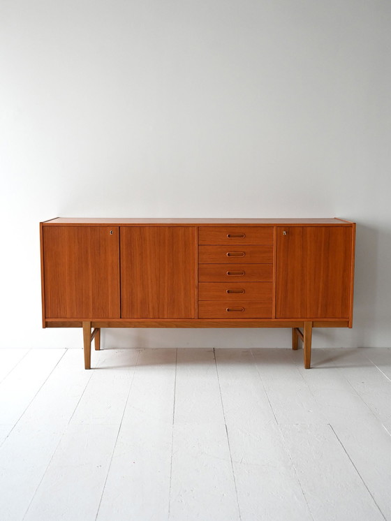 Des lignes essentielles et des proportions équilibrées définissent ce buffet scandinave en teck des années 1960. Deux portes battantes à gauche, quatre tiroirs centraux et une autre porte battante à droite, toutes avec des poignées encastrées. À l'intérieur, une étagère offre un espace de rangement supplémentaire. La structure repose sur des pieds géométriques effilés.