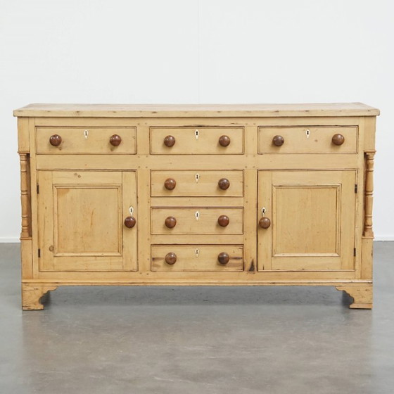 Ce meuble anglais ancien de caractère est fabriqué en bois de pin brut et date du 19ème siècle. Il constitue un excellent complément à tout intérieur. Il peut être utilisé à de multiples fins, notamment comme buffet, table d'appoint, comptoir ou îlot de cuisine. Par exemple, il est parfait dans une cuisine de campagne, où l'on peut préparer des herbes fraîches et des aliments. Bien entendu, il peut également servir de buffet ou de meuble de télévision. Ce qui rend ce meuble unique, c'est qu'il présente des détails originaux, tels que de magnifiques sculptures. Il est équipé de 6 tiroirs et de 2 portes, ce qui vous donne beaucoup d'espace de rangement. En raison d'une utilisation responsable, il présente des signes d'usure normaux. Structurellement, il est encore en bon état et immédiatement utilisable. Quelle utilisation feriez-vous de ce meuble étonnant ?