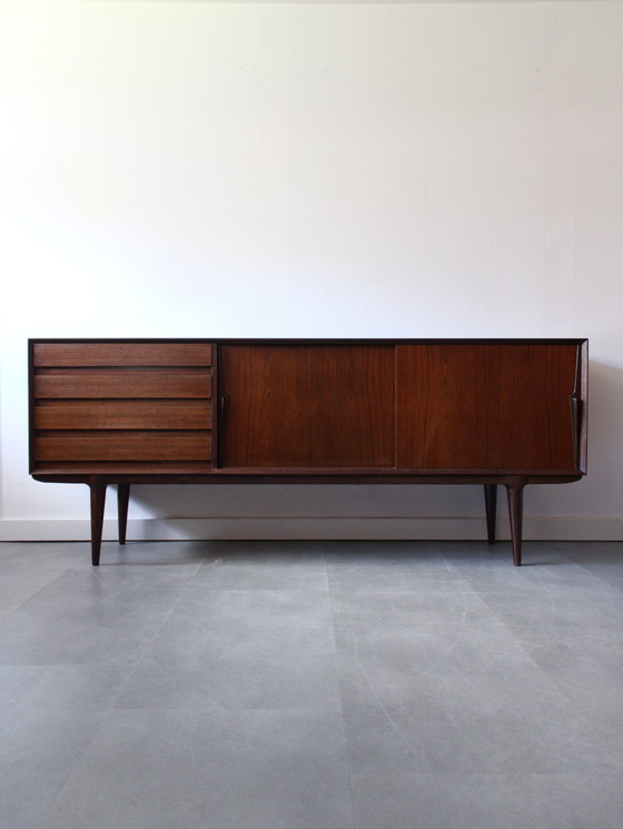 Buffet danois vintage en bois de rose, conçu par Gunni Omann pour Omann Jun Møbelfabrik. Il s'agit du modèle 18, l'un des modèles les plus emblématiques des années 1960. Ce meuble est un bel exemple de l'artisanat scandinave, avec un design raffiné et un motif chaud et vivant dans le bois de rose qui donne au buffet un aspect luxueux.
