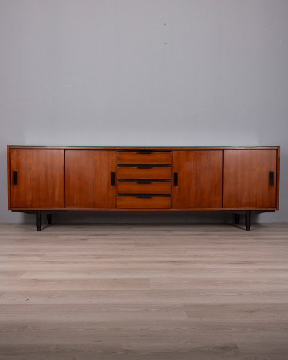 Buffet en teck avec détails en bois noir et plateau en verre, design italien, années 1960.
