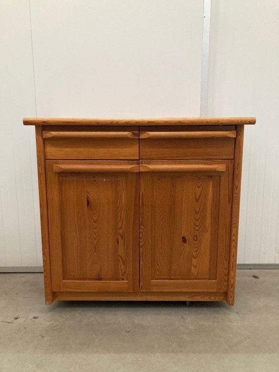 Buffet en pin massif des années 1970. Deux tiroirs et portes, une étagère. Dans le style de Rainier Daumiller. Très beaux détails dans les poignées. Le buffet est en très bon état avec quelques signes d'utilisation correspondant à l'âge. Dimensions : Largeur : 100cm Largeur : 100cm Profondeur : 50cm Hauteur : 90cm