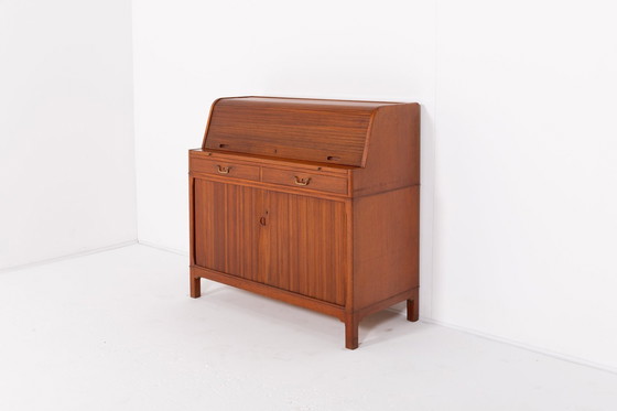 Spectaculaire et élégante armoire-bureau en acajou et en teck de Carl-Axel Acking pour Nordiska Kompaniet, Suède, années 1950. La pièce comporte des portes vénitiennes pliantes, un espace de rangement et de petits tiroirs coulissants derrière elles. La façade est équipée de deux tiroirs et d'une plaque coulissante pour écrire. État moyen, usure liée à l'âge et marques d'usage. Dimensions hauteur : 103 cm profondeur : 50 cm largeur : 110 cm
