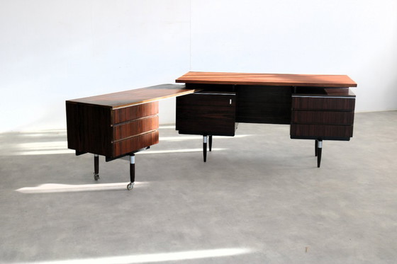 Bureau de direction vintage | Bureau | Poste de travail | Années 1960 Époque : Années 1960 Design : Inconnu État : Bon | Légères traces d'usure Dimensions du bureau : 77,5 x 160 x 70 cm (H x L x P) Dimensions du caisson : 70,5 x 130 x 48 cm Détails : Palissandre ; Chrome ; Plateau amovible Numéro d'article : 3009