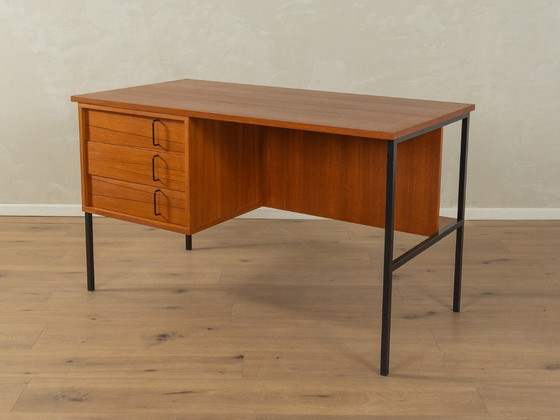 Bureau autoportant minimaliste des années 1960, créé par Günter Renkel pour Rego Möbel. Corpus en placage de teck avec trois tiroirs, une bibliothèque à l'arrière et des pieds carrés en acier noir. Caractéristiques : très bonne finition, matériaux de haute qualité, tiroirs en bois massif. Fabriqué en Allemagne. Concepteur : Günter Renkel, fabricant : Rego Möbel.