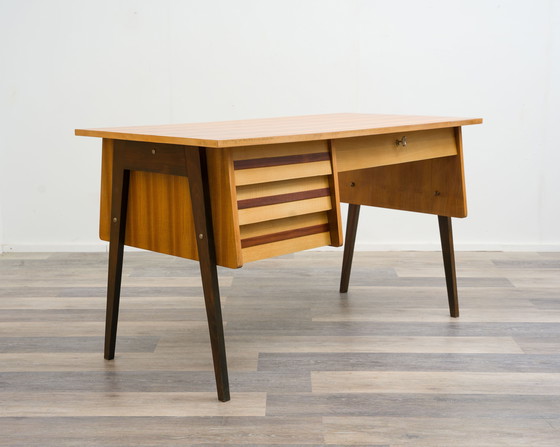 Très beau bureau des années 50 avec pieds en ciseaux en bois massif teinté foncé. La surface et le corps sont en noyer et ont été restaurés de manière professionnelle. Sous le plateau du bureau se trouve un grand tiroir verrouillable et à gauche trois tiroirs avec une bande de bois décorative de couleur foncée appliquée. Beau placage en noyer sur la surface. Façades des tiroirs en placage de frêne.