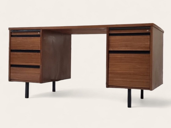 Ce bureau est équipé de deux caissons de tiroirs de chaque côté, offrant un total de huit tiroirs et un espace de rangement généreux.