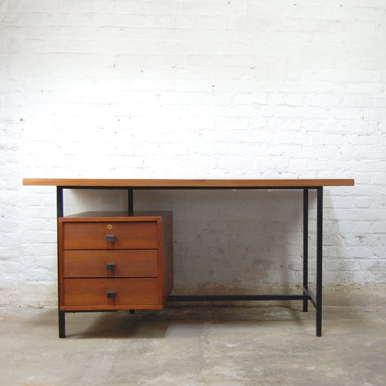 Bureau à 3 tiroirs modèle "Ariel" de Jean Domps, édition Trefac - Meurop circa 1960. Structure métallique laquée ton noir, plateau et caisson en aggloméré plaqué teck verni, tiroirs en bois. Version rare avec poignées des tiroirs en métal laqué noir. Il est vraissemblable que cette édition ai été créée spécialement pour s'associer aux premières séries de meubles dessinés par Pierre Guariche et édités en décembre 1960, eux aussi munis de poignées en métal laqué noir. C'est le seul exemplaire avec de ce type de poignées que nous ayons rencontré à ce jour. Pièce rare.