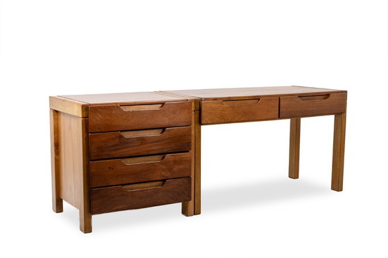 Bureau plat et son caisson en orme, 6 tiroirs en façade. Années 1970