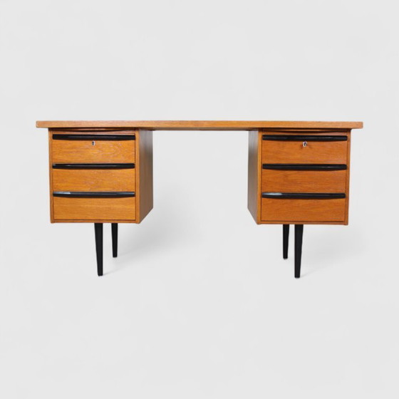 Bureau Mid Century des années 1960, en placage de bois. Ce bureau ou écritoire est doté de pieds et de poignées noirs. Le dos du bureau est également fini, ce qui permet de le placer facilement au milieu d'une pièce.