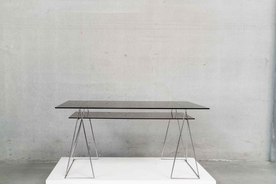 Le bureau comporte deux plateaux horizontaux, rectangulaires, en verre teinté foncé. Ils sont soigneusement empilés l'un sur l'autre, avec un peu d'espace entre eux.