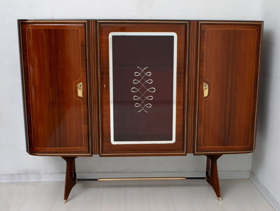 Superbe meuble de bar attribué à Gio Ponti, en acajou et érable et incrustations de laiton, la vitre centrale est entourée d'un miroir et d'une gravure centrale qui représente l'infini, un dessin typique de Gio Ponti, le dessus du meuble est en verre peint et décorations florales.