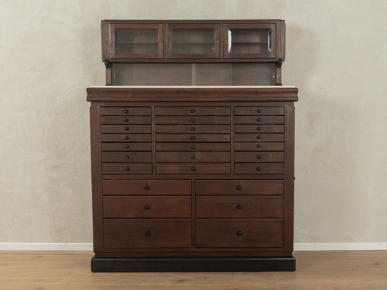 Cabinet dentaire unique des années 1920. Corpus en bois de haute qualité avec 27 tiroirs, trois portes en verre, trois étagères, deux portes coulissantes en verre, deux portes, une étagère en verre de porcelaine blanche et une base noire contrastante. Fabriqué en Allemagne.