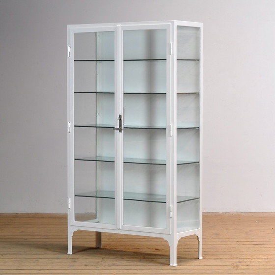 Cabinet médical des années 1930. Fabriquée en Hongrie, elle est faite de fer épais et de verre antique. Avec les étagères en verre d'origine de 8 mm d'épaisseur. Les plaques ont une teinte verte due au plomb contenu dans le verre. La serrure et la poignée sont également d'origine et fonctionnelles.