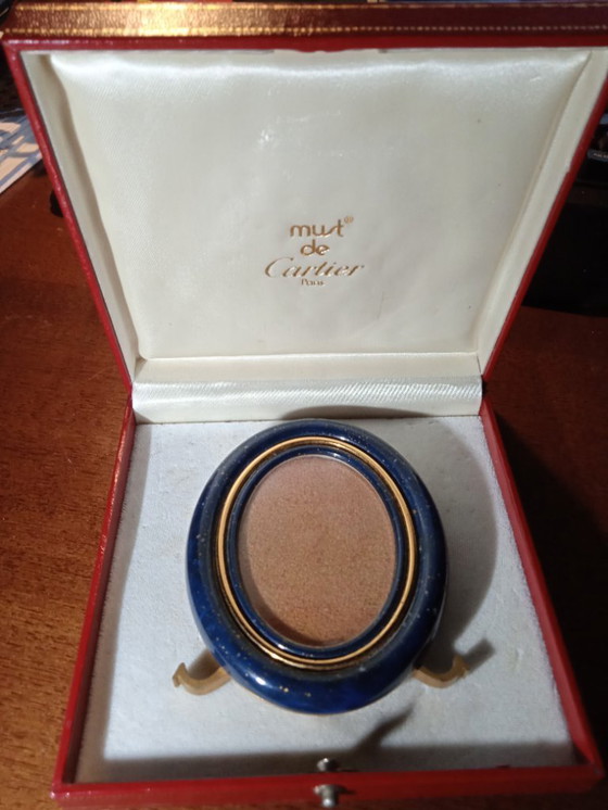 Découvrez l'élégance intemporelle de ce cadre Cartier raffiné, un véritable bijou pour les amateurs de design classique. D'une facture exceptionnelle, ce cadre présente un contraste captivant entre le bleu profond et l'or brillant, sublimé par un écrin rouge qui souligne son raffinement.