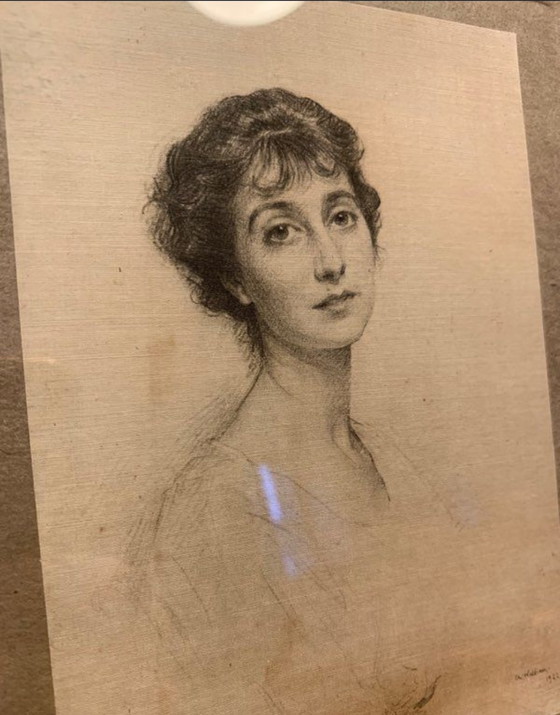 Très joli sous verre représentant un portrait de jeune femme, signé et daté de 1922, s'agit-il d'un dessin ou d'une technique type lithographie sur un très fin tissu?
