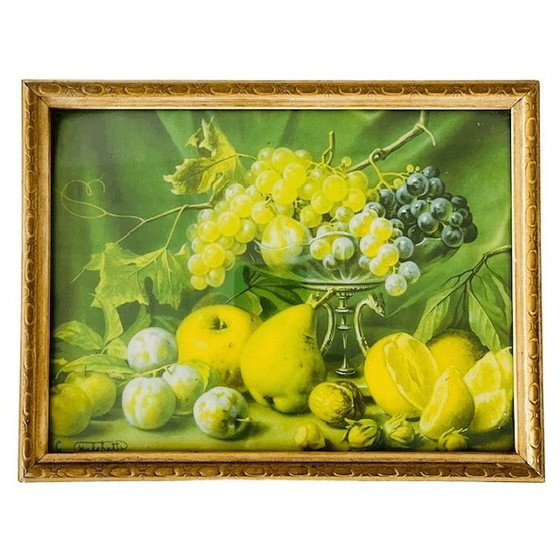 Le cadre de la lithographie de fruits des années 1940 mesure 26 cm de haut, 20 cm de large et 1 cm de profondeur. Il est signé en bas avec le nom de Marlehetti.