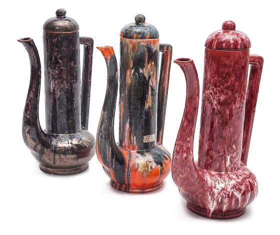 Trio de cafetières émaillées du village de Sars-Poteries. Circa 1960. Le village de Sars-Poteries (département du Nord) doit la seconde partie de son nom aux nombreuses fabriques de poteries artisanales qui remontent au XVIII e siècle.En 1838, il y avait neuf poteries de terre, huit poteries de grès, et une carrière de cendres fossiles.Seuls de petits ateliers (Maine, Lempereur…) qui fabriquaient des pots, cruches, vases et récipients divers subsistaient encore dans les années 1970 1980.