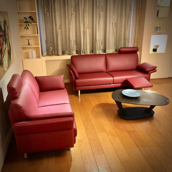 Canapé 2,5 places Artanova avec son ensemble 2 places Melide, de la prestigieuse marque suisse Artanova : ce canapé 2+2,5 places est doté de pieds réglables, permettant d’ajuster la hauteur et l’inclinaison. Chaque canapé comprend un repose-pieds escamotable et un appui-tête amovible et pliable. Les accoudoirs sont réglables sur quatre positions, de l’horizontale à la verticale. Revêtement en cuir pleine fleur Karmin rouge de 2,4 mm d’épaisseur.