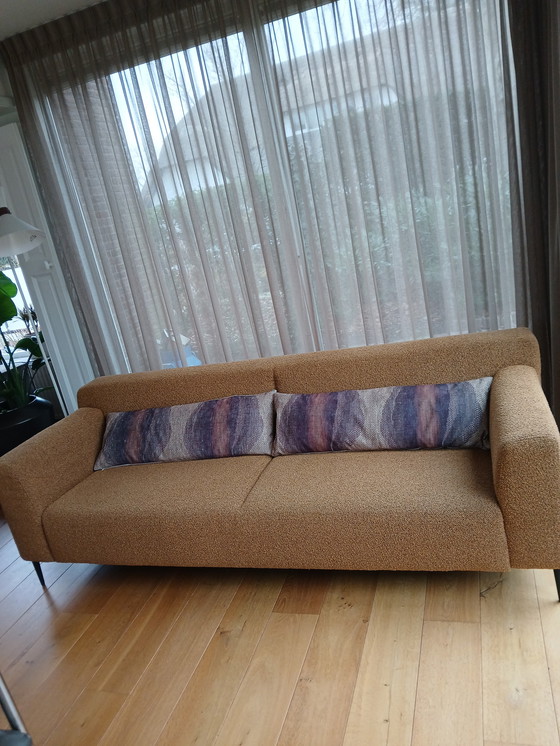 Canapé 3 places moderne de DYYK. Le revêtement jaune moutarde est en tissu bouclé. Le canapé repose sur des pieds en bois. Les coussins inclus ont été achetés récemment chez De Bijenkorf.