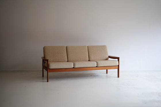 Canapé 3 places conçu pour Komfort Møbelfabrik dans les années 1950. La structure est en teck et le revêtement en laine grossière. Un canapé 2 places et un fauteuil assorti sont également disponibles.