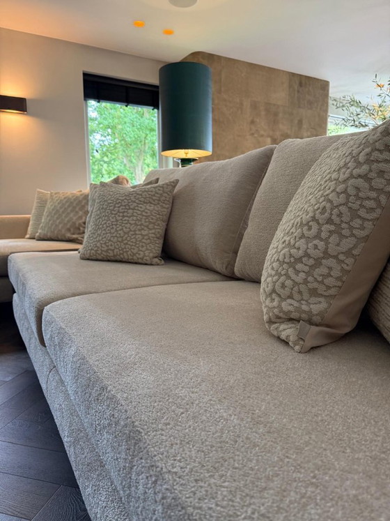Canapé en excellent état, coloris Milano, avec table d'appoint. Marque : Puuur. Configuration (de gauche à droite) : élément lounge de 1140 mm, élément d'assise avec accoudoir droit de 2600 mm. Dimensions extérieures (de gauche à droite) : 1850 x 4140 mm, table d'appoint incluse.