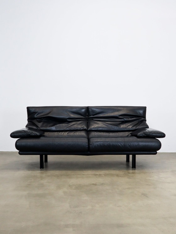 Canapé Alanda en cuir noir conçu par Paolo Piva pour B&B Italia dans les années 1980. Le modèle est disponible en différentes tailles, celui-ci est de 210 cm de long. Le canapé est d'époque, mais en bon état. La tête et les accoudoirs sont réglables et le canapé a des pieds en métal noir.