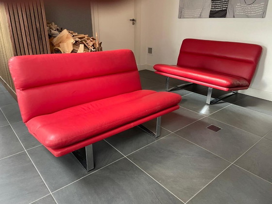 Ce magnifique canapé deux places, conçu par Kho Liang Ie dans les années 1960, est une véritable icône du design. Revêtu d'un cuir rouge de haute qualité, il offre un confort exceptionnel. Sa structure métallique épurée lui confère son style minimaliste caractéristique. Détail unique : les coussins du dossier et de l'assise sont confectionnés d'une seule pièce – un exemple parfait du design néerlandais.